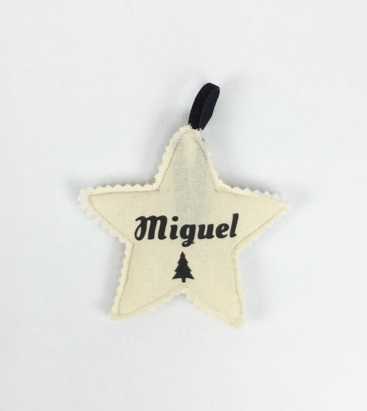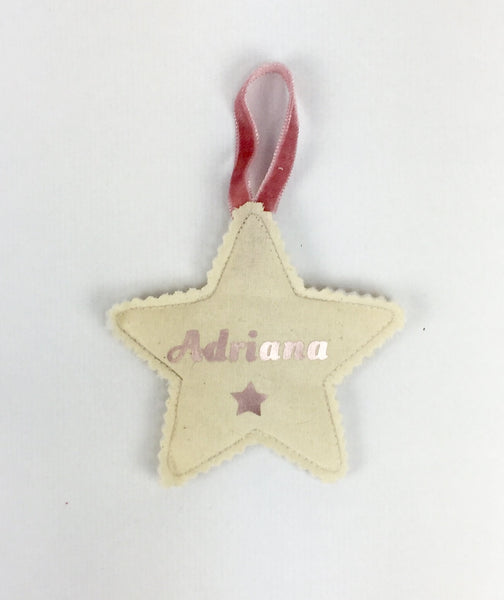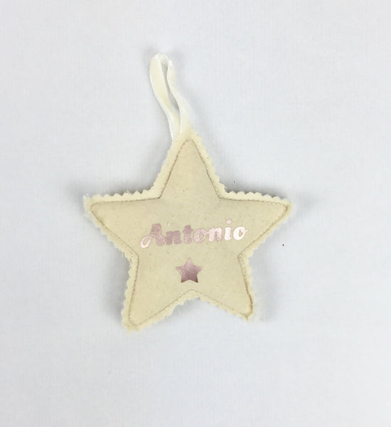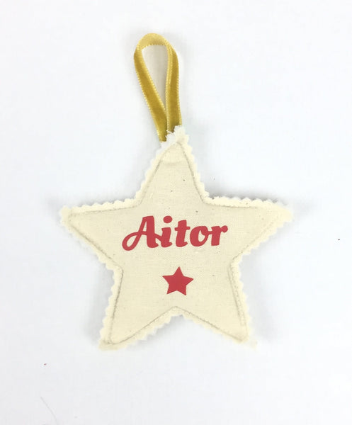 Adorno para el arbol de navidad en forma de estrella , hecha en tela de algodón 100% orgánico .